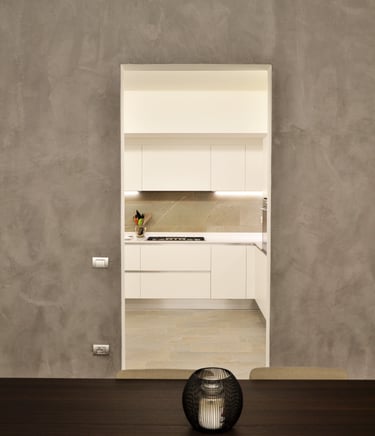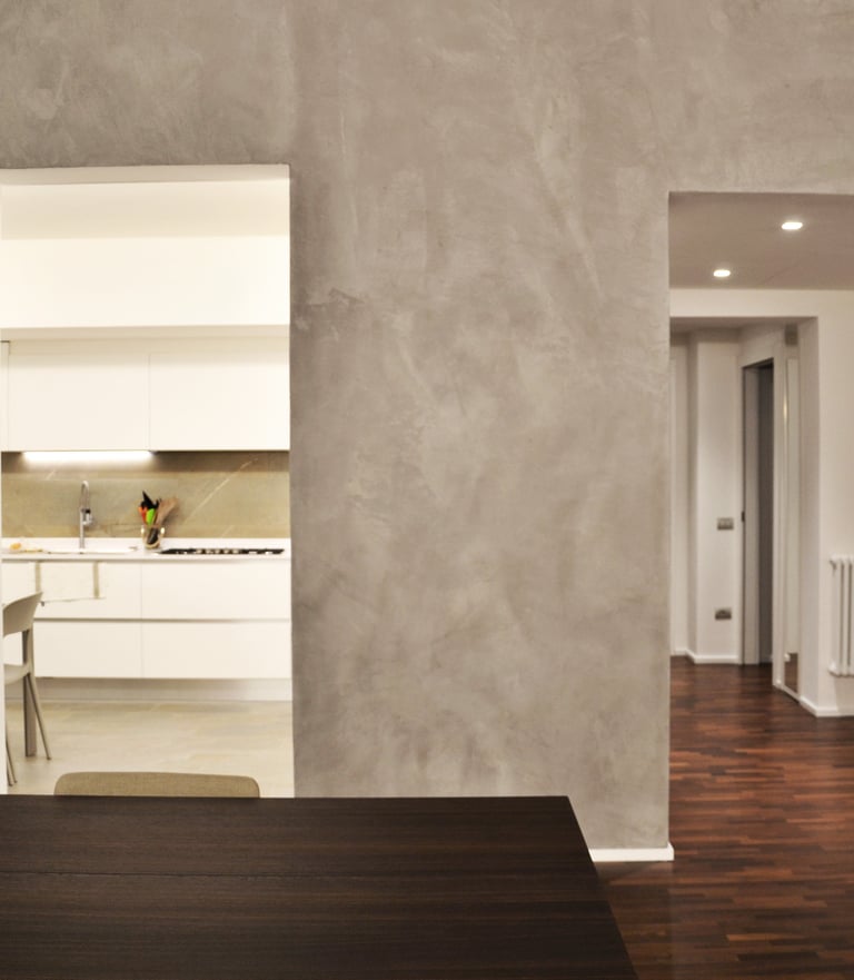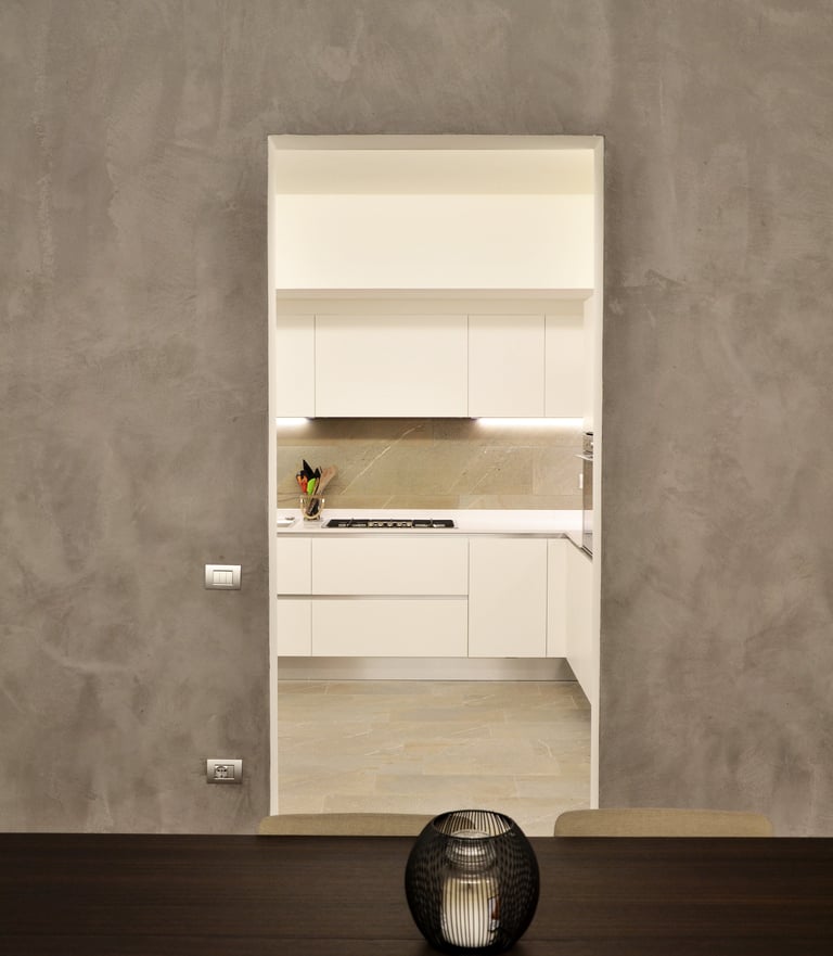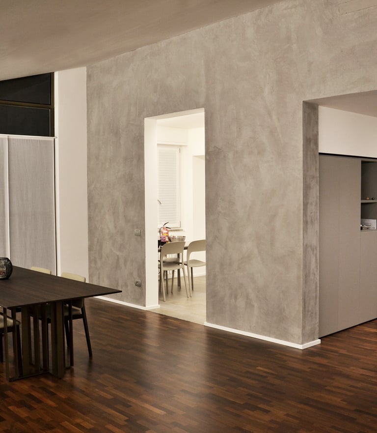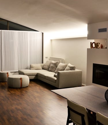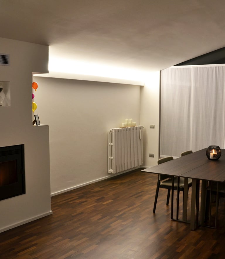 The peculiar feature of this 100 sqm apartment is the large open-plan living room featuring two large opposite windows and the sloping roof. These peculiarities have determined the organization of the spaces, the positioning of the furnishings and the choice of the type of lighting with the aim of enhancing its architectural characteristics.