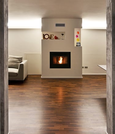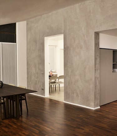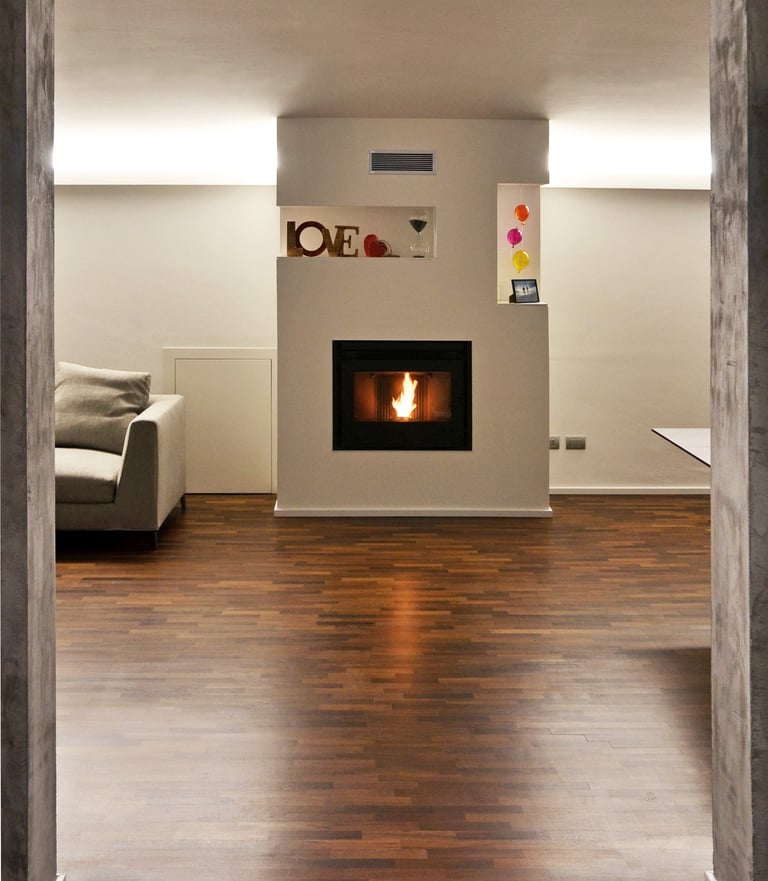 The furniture containing the chimney serves as a fulcrum around which the living room and the dining area are connected, all connected by a light ledge blade. A massive exposed concrete wall separates the living area from the kitchen and from the distribution hallway to the sleeping area.